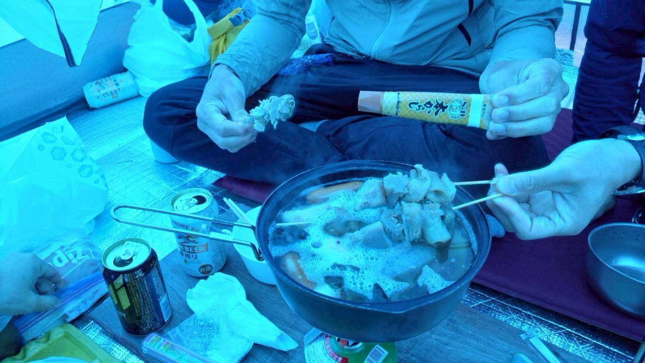 剱沢キャンプ場は空いていて一等地にテントを張り、早々に身支度をして翌日登る源次郎尾根の取付きの下見に出掛ける。源次郎尾根は剱沢小屋から真砂沢方面に下った途中にある平蔵谷と長次郎谷に挟まれた尾根で、夏道から雪渓を渡って取付くのが通常ですが、時期的に雪渓が崩落していて危険で渡れません。出発前にリーダーが室堂警備派出所に問い合わせたルートは平蔵谷出合までは右岸の破線ルート沿いを歩き、状況を見て下から回り込んで取付くとのことでしたが行けそうにもありません。後から来たパーティーは雪渓の手前の沢を渡ってザレた斜面で落ちながらも通過して行きましたが、とても危険そうなので翌日は安全な一般ルートで剱岳に登る計画に変更しました。そうと決まれば早急にテントに戻って宴会の始まりです。S子さんが作ってきてくれた美味しいおでんで乾杯! そして翌日に備えて早めに就寝。