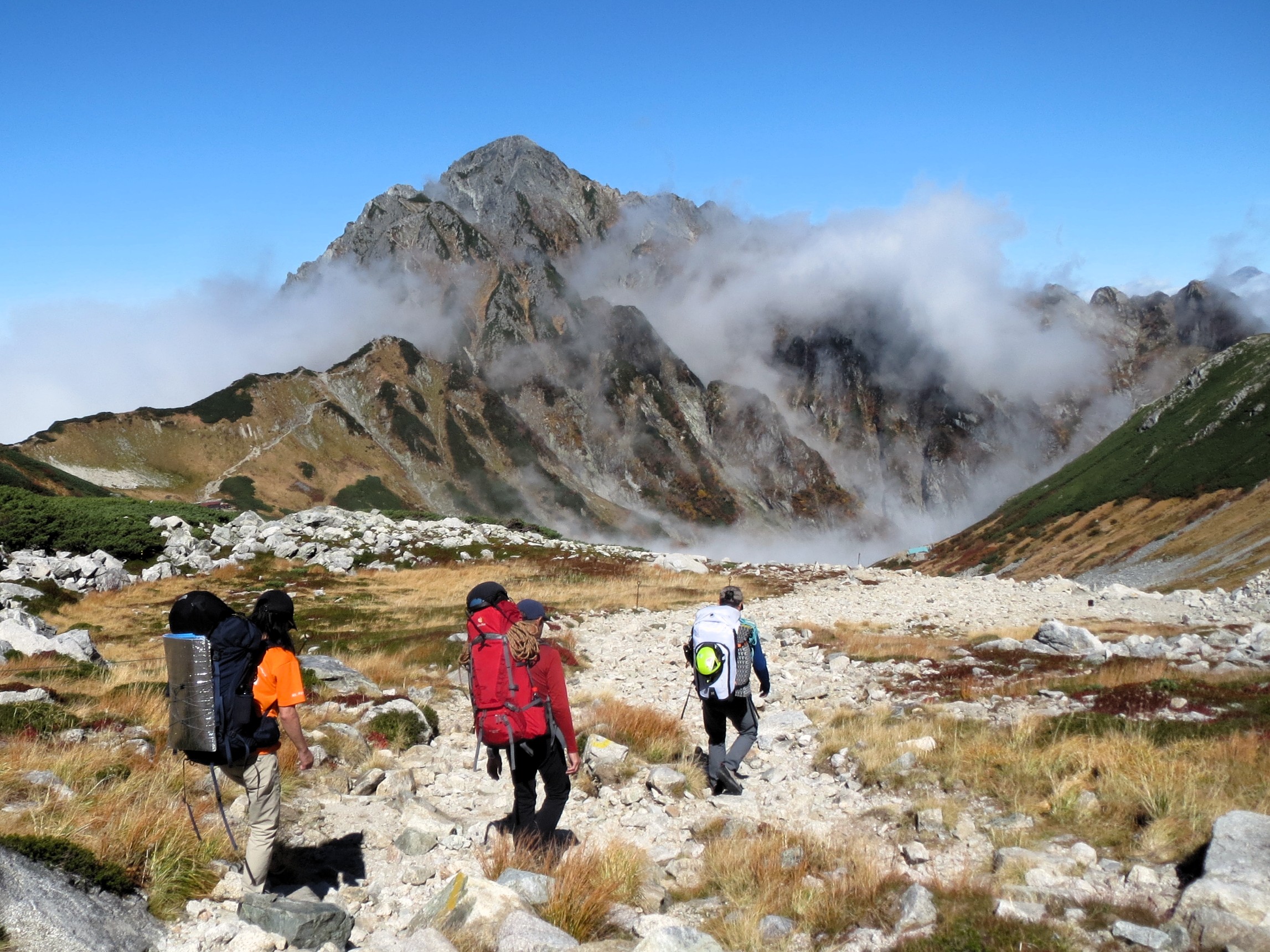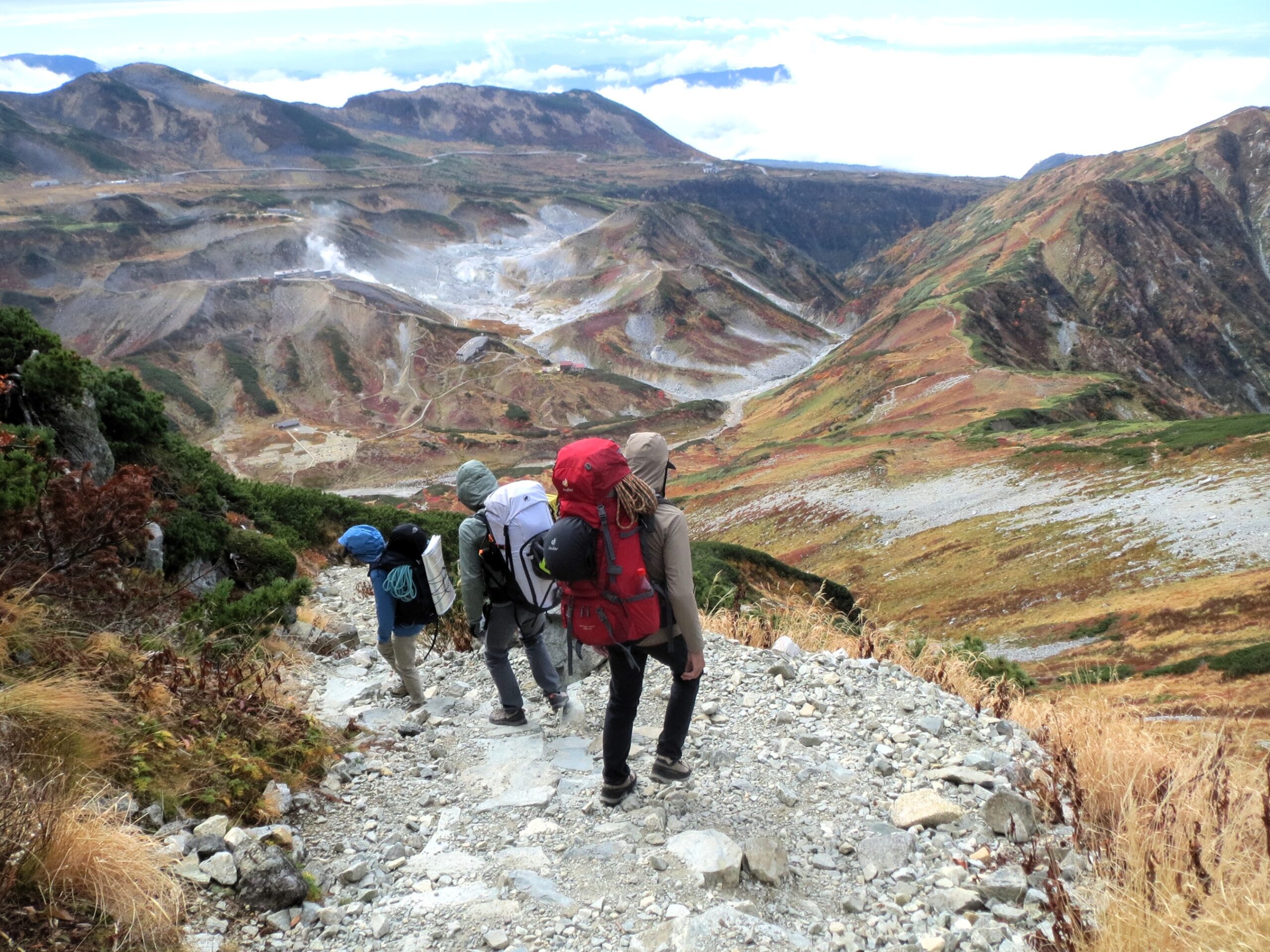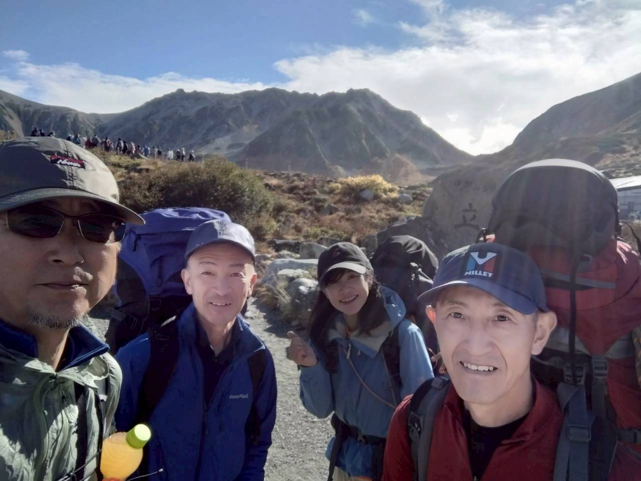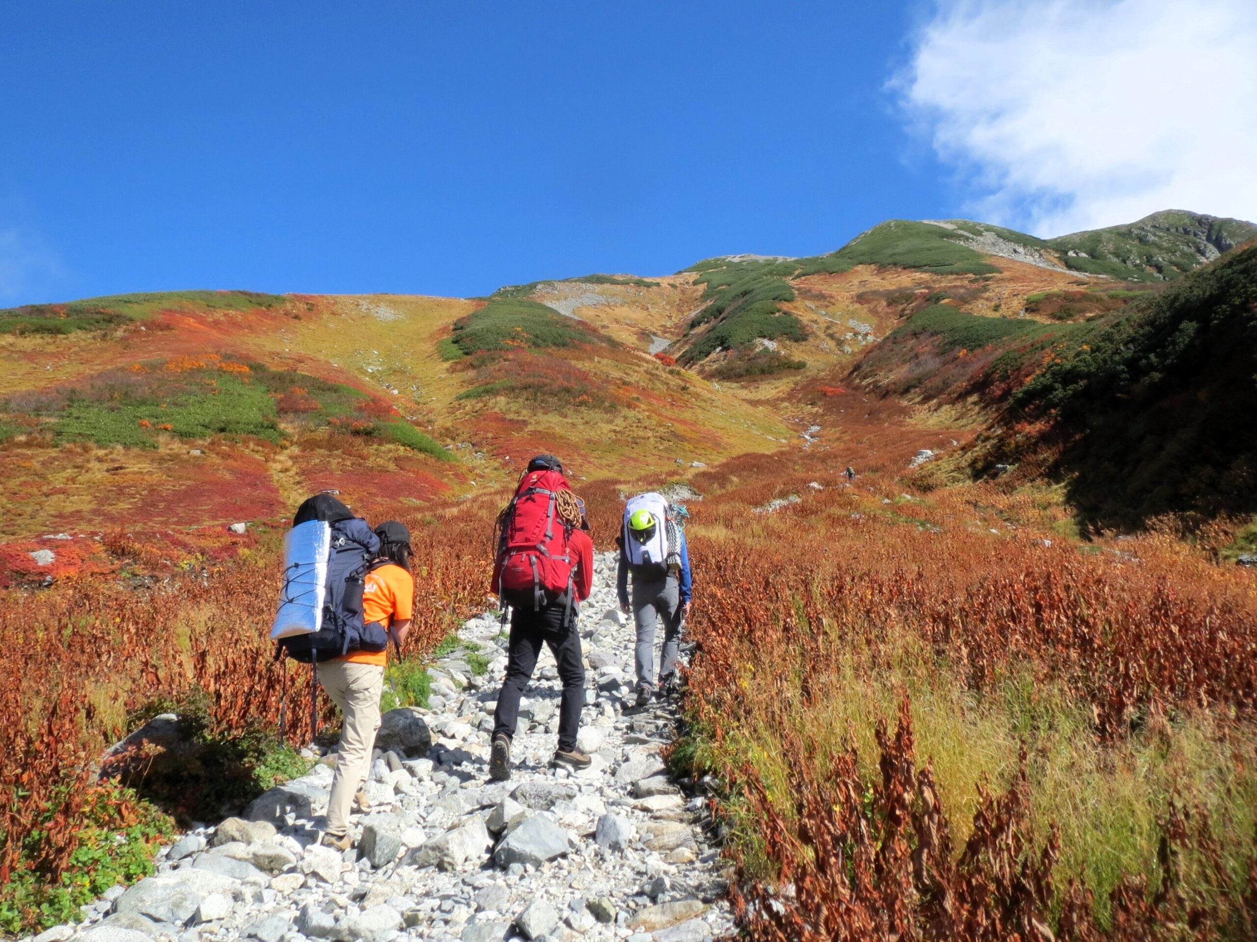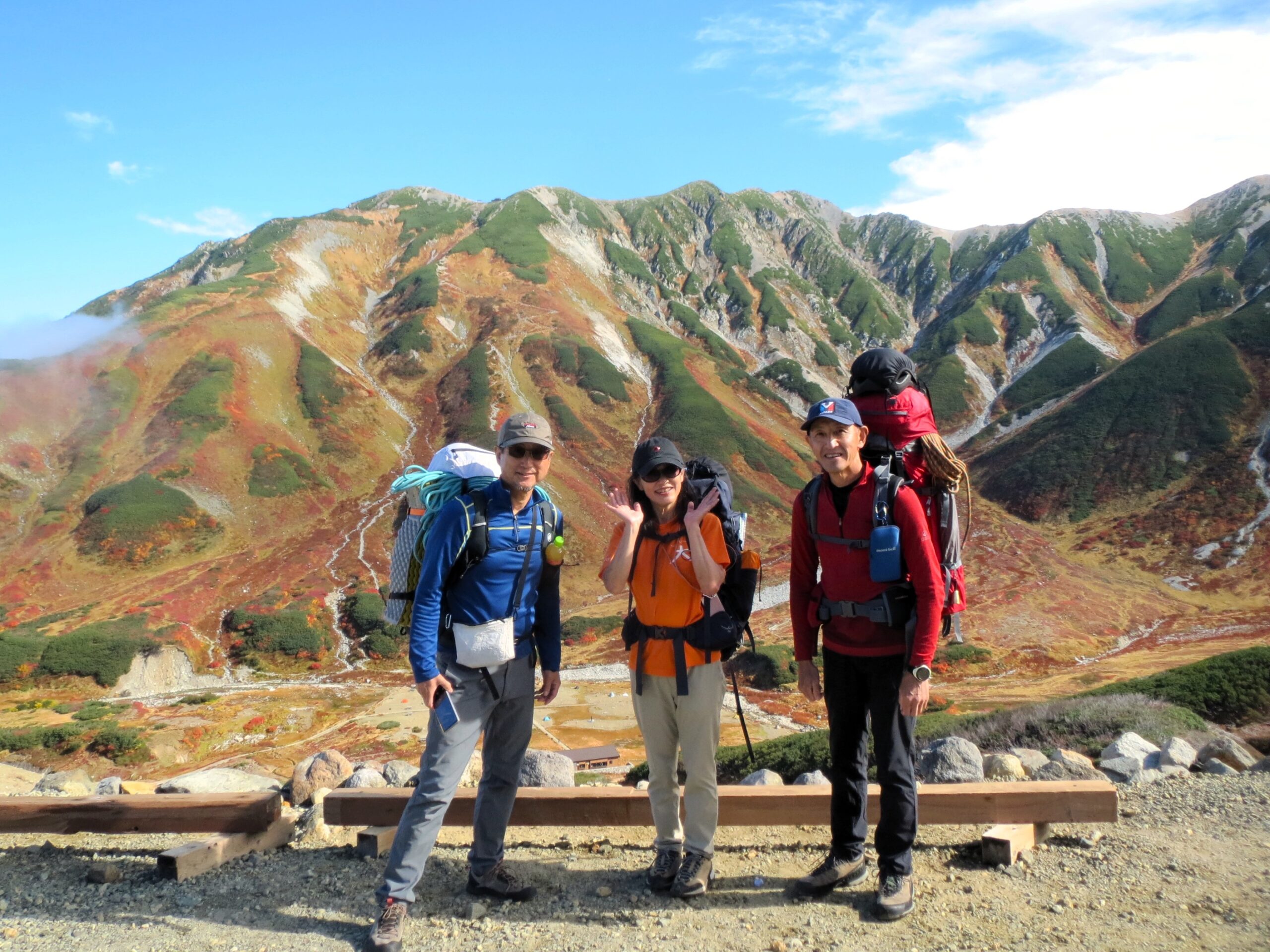 下山路にあるカニのヨコバイを軽々と通過のS子さん計画ではテントであと一泊する予定でしたが、みんなのペースが揃っていたおかげで、予定よりも早く剱沢キャンプ場に戻ることができました。この調子なら今日中に下山して長野のホテルに泊まり、美味しい食事が楽しめるかも、という話になり、急いでテントを撤収して重い荷物を背負い、剱御前小屋までの登りを頑張ることに。K林はペースが上がらず小屋で少し長めの休憩を取り、紅葉が美しい室堂へと下っていきます。雷鳥平からの最後の階段もみんなに遅れながら上って室堂に14:00到着。室堂では前日よりも紅葉がより赤くなった感じがしましたが、それ以上に観光客が溢れていたのが驚きでした。