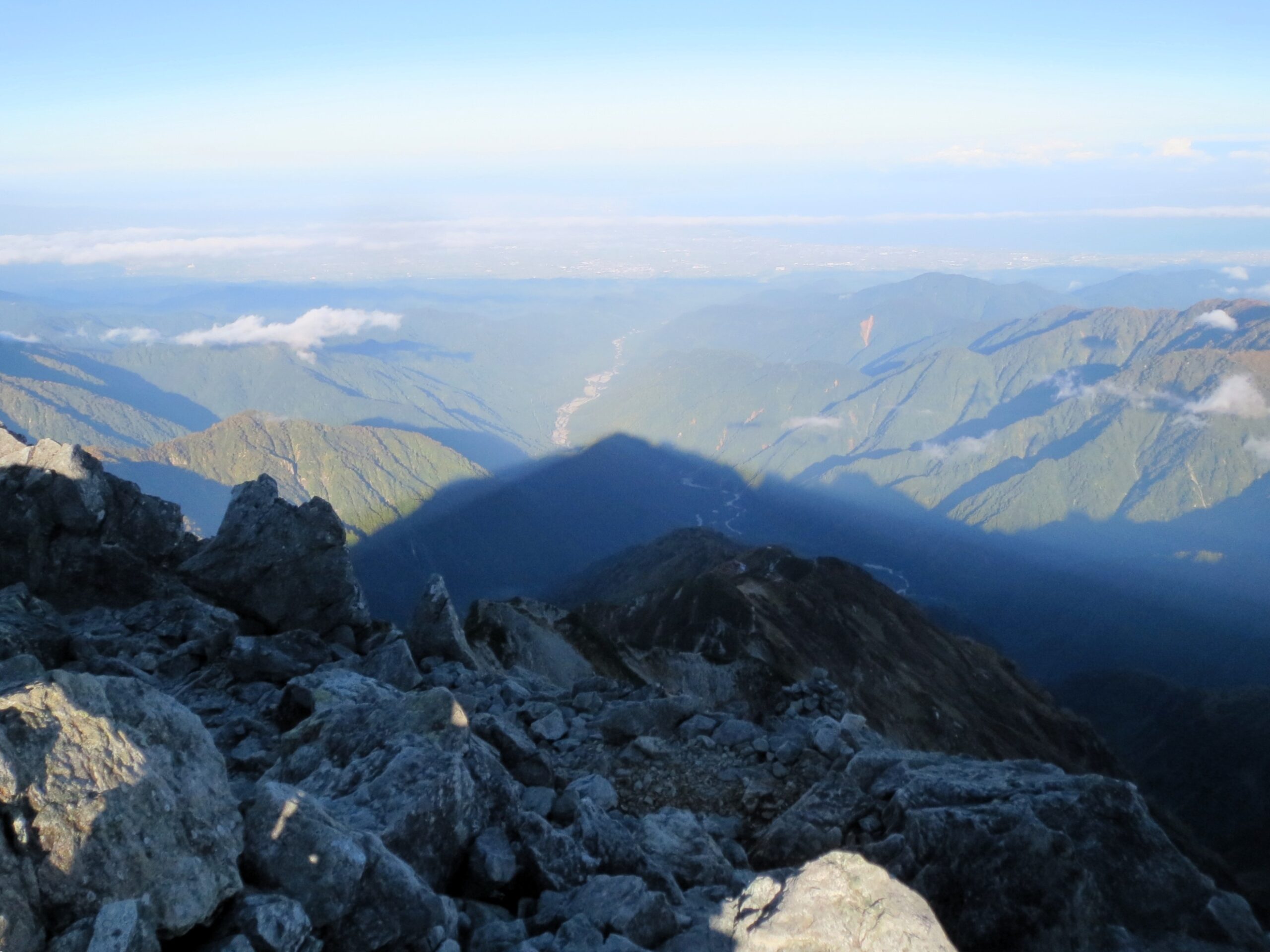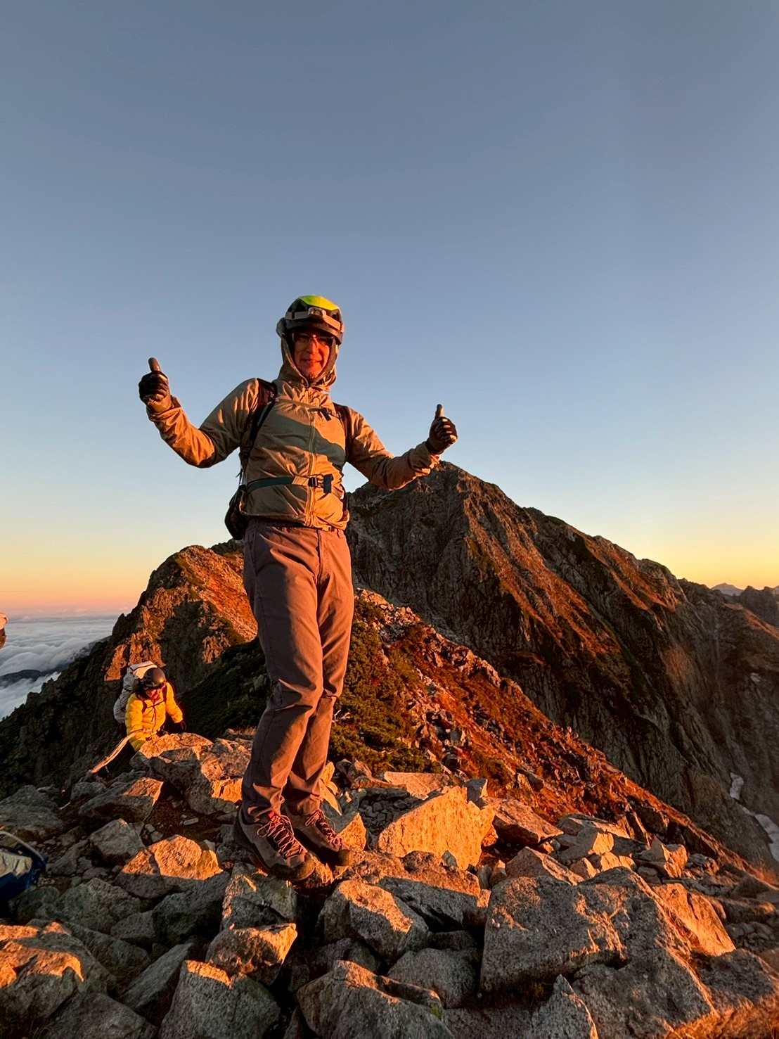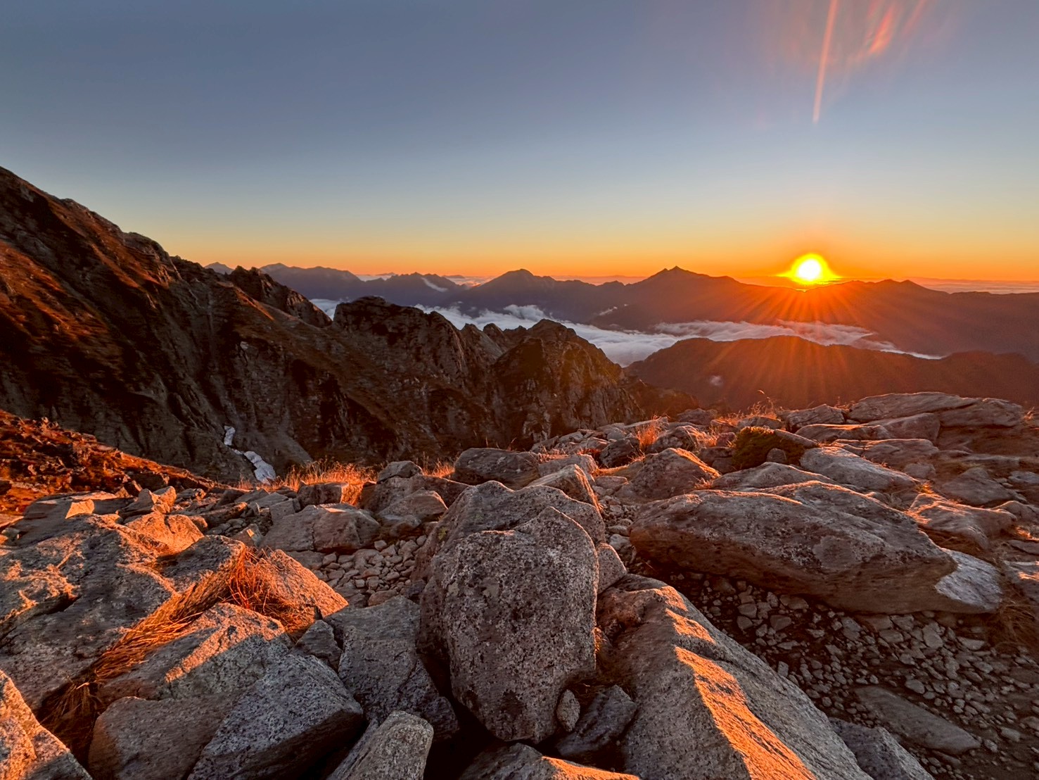 10月10日、天気は晴れ。午後から天気が崩れる予報のため3時に起床し、4時に出発して早めに下山することに。前日にお酒を控えめにしたおかげか、みんな快調に歩き始めた。一服剱の辺りで地平線が赤く染まり始め、静かに朝日が昇ってきた。その感動的な瞬間にみんなの足が自然と止まる。予報されていた稜線上の強風は無く、他の登山者も少ししかいない静かなこの山に来られて、本当に良い時間を過ごしていると感じました。カニのタテバイなど数々の鎖場も難なく通過して剱岳山頂に7:00到着。剱岳の影も眺められ、30分ほど写真撮影を楽しんだり山頂での時間を満喫して下山しました。