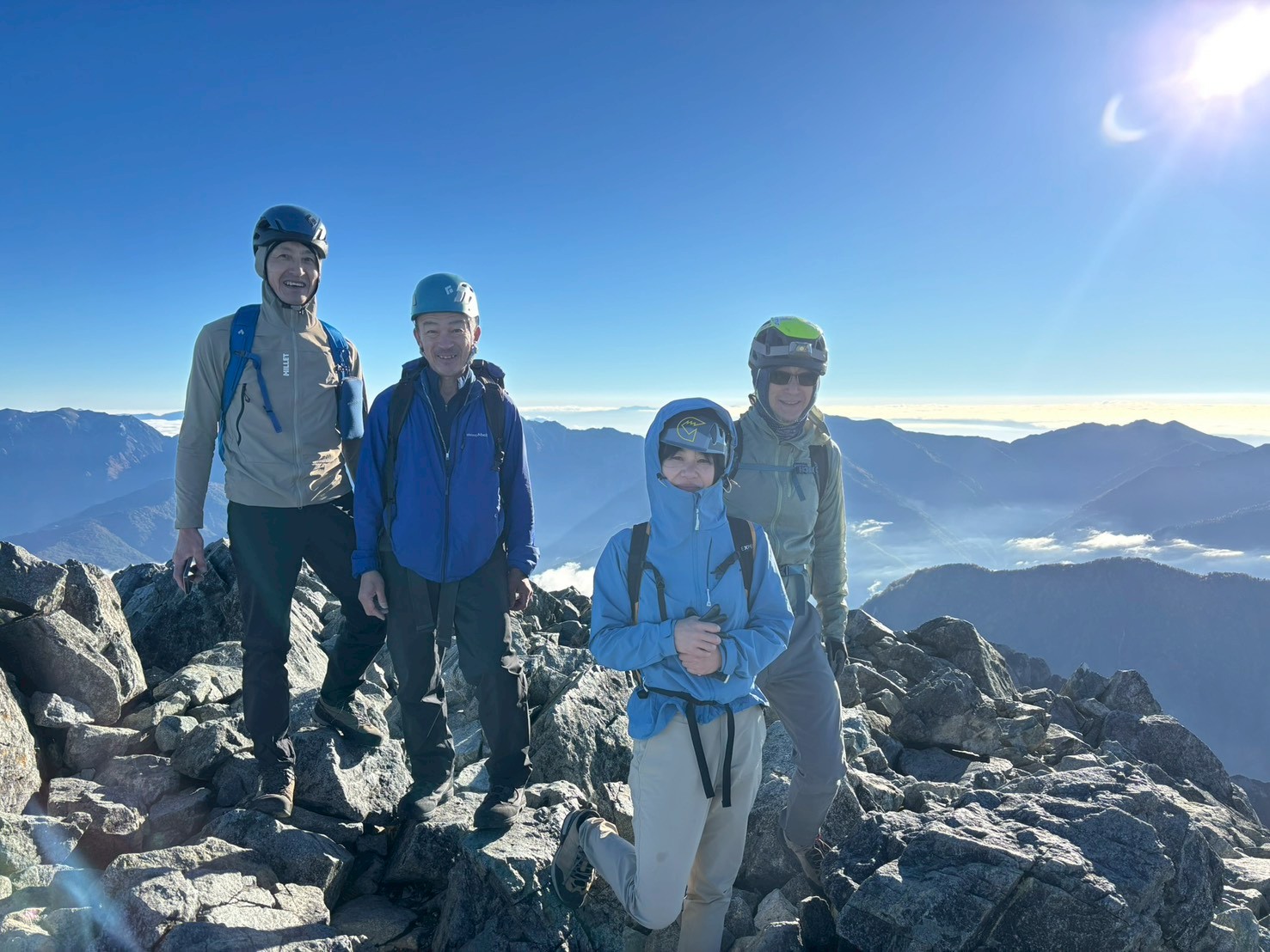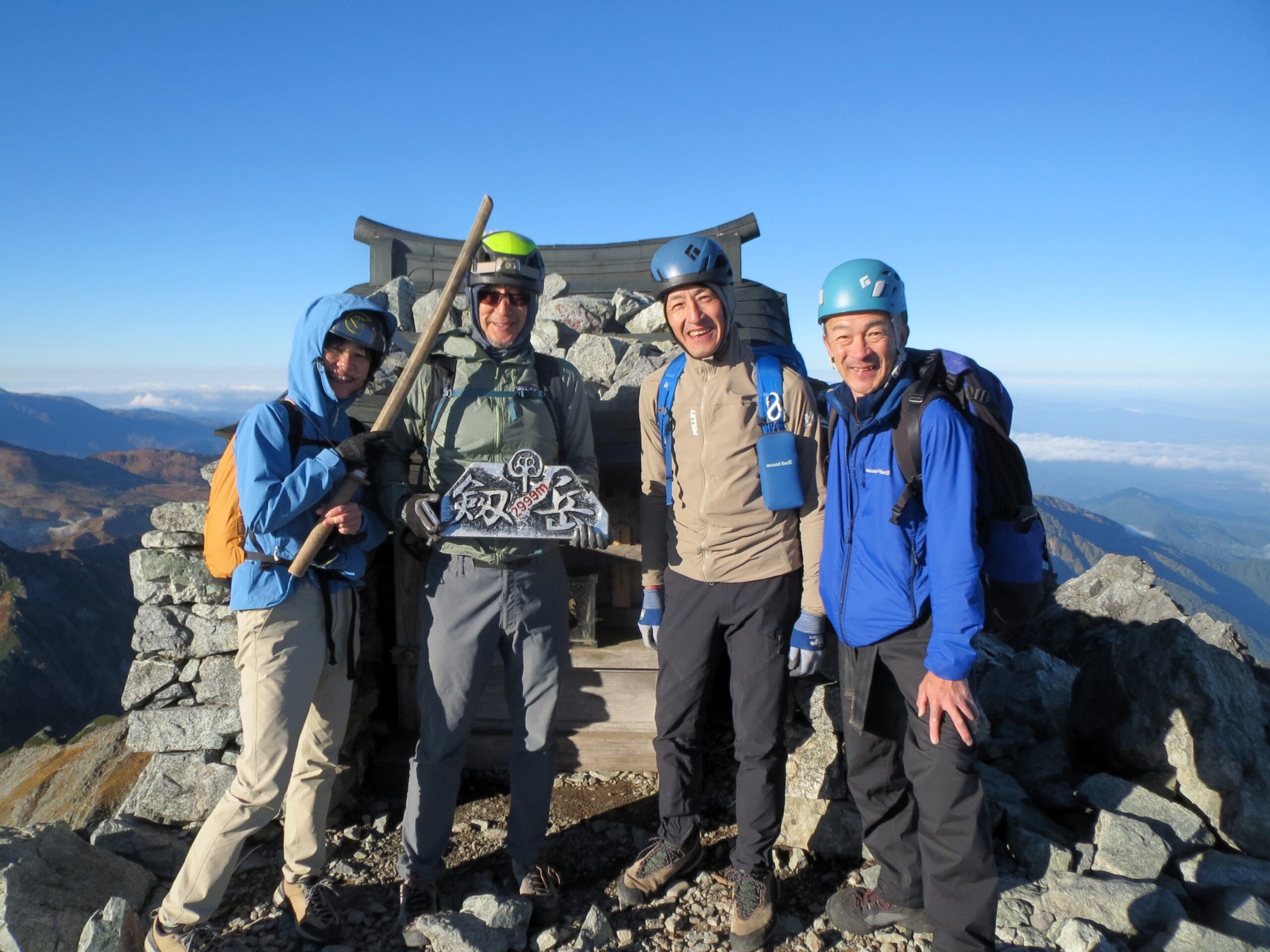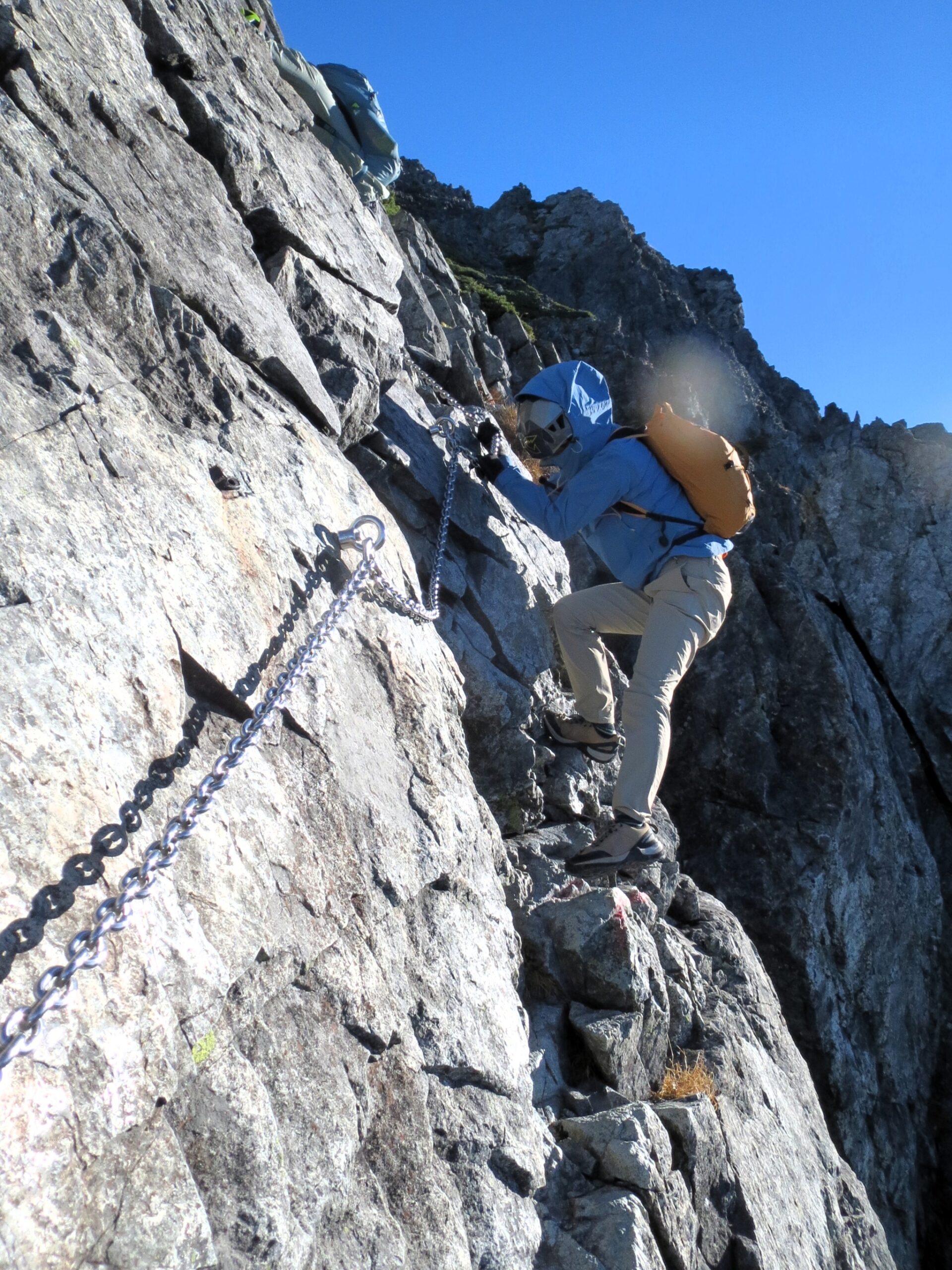 10月10日、天気は晴れ。午後から天気が崩れる予報のため3時に起床し、4時に出発して早めに下山することに。前日にお酒を控えめにしたおかげか、みんな快調に歩き始めた。一服剱の辺りで地平線が赤く染まり始め、静かに朝日が昇ってきた。その感動的な瞬間にみんなの足が自然と止まる。予報されていた稜線上の強風は無く、他の登山者も少ししかいない静かなこの山に来られて、本当に良い時間を過ごしていると感じました。カニのタテバイなど数々の鎖場も難なく通過して剱岳山頂に7:00到着。剱岳の影も眺められ、30分ほど写真撮影を楽しんだり山頂での時間を満喫して下山しました。