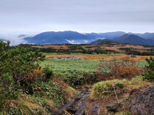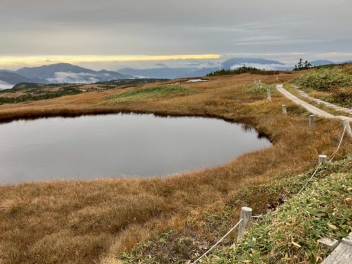 必死に登りきると、広大な草紅葉と池塘の頂上の大地に到着しました。見渡す限り山並みと雲のながれ、草紅葉の草原。頂上の