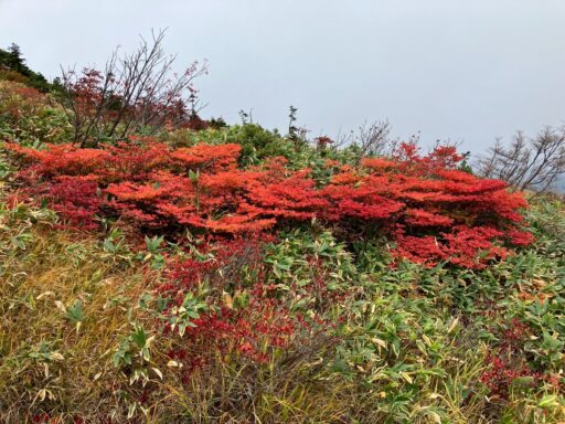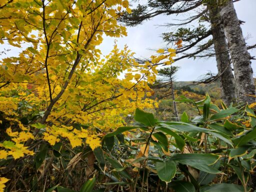 笹原の緑にカエデの黄色、ツツジやナナカマドの赤がかがやいている。