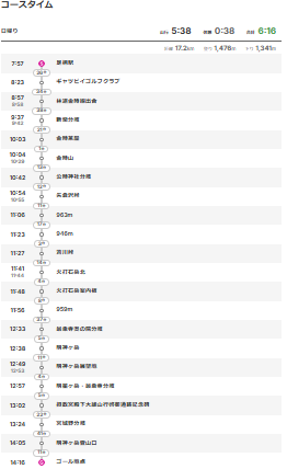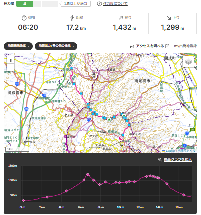 17Km、高低差上り1400m、下り1200mとまあまあ早く歩かないと