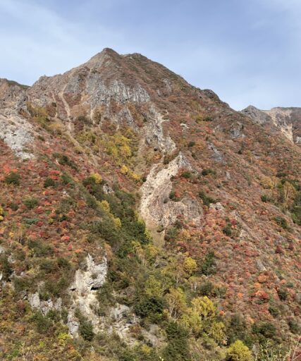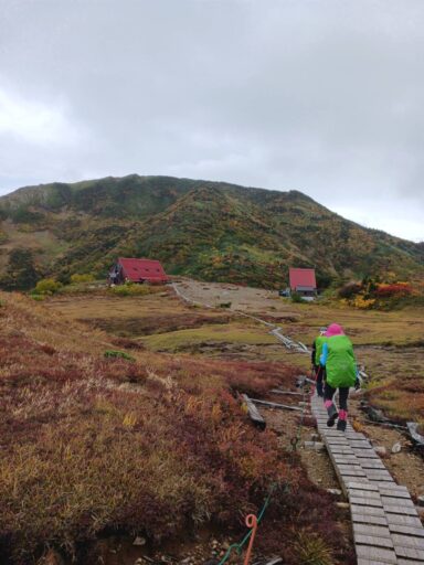 峰の茶屋跡避難小屋から、朝日岳の紅葉を見ながら下山