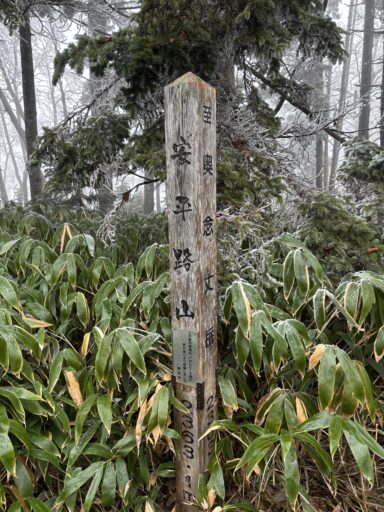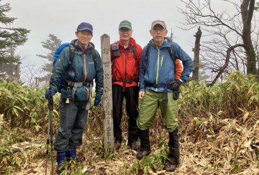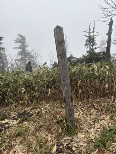 明るくなって摺古木山頂上に着く。ガスで見通しはきかない。