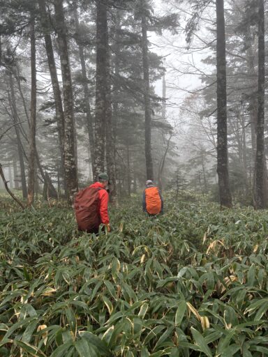 トレースのある藪漕ぎと侮ってはいけない。笹の下に隠れた倒木、岩の段差など、瞬発力や適応力の劣化したおっさん達に容赦なく襲い掛かり、そして見事に引っかかる。さらに雨粒と夜露で雨具はびしょ濡れである。