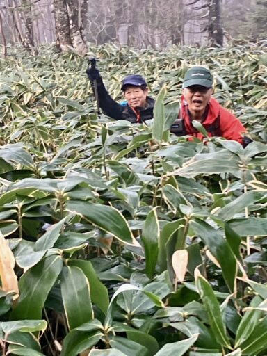 おっさん達は淡々と往路を戻るのである。下りの藪漕ぎは疲れとともにヨレヨレである。