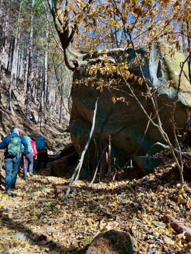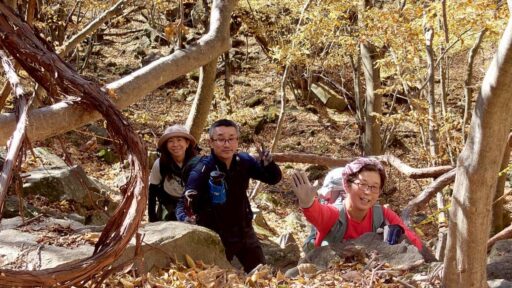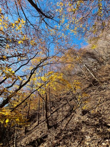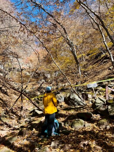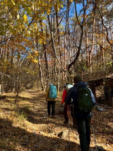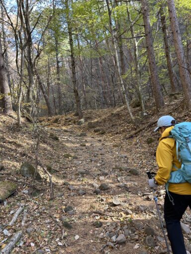 とにかく、落ち葉がもりもりで石や根っこが隠れているのが秋の山。一歩一歩進みます。