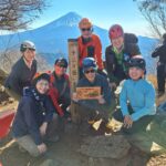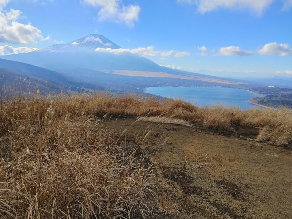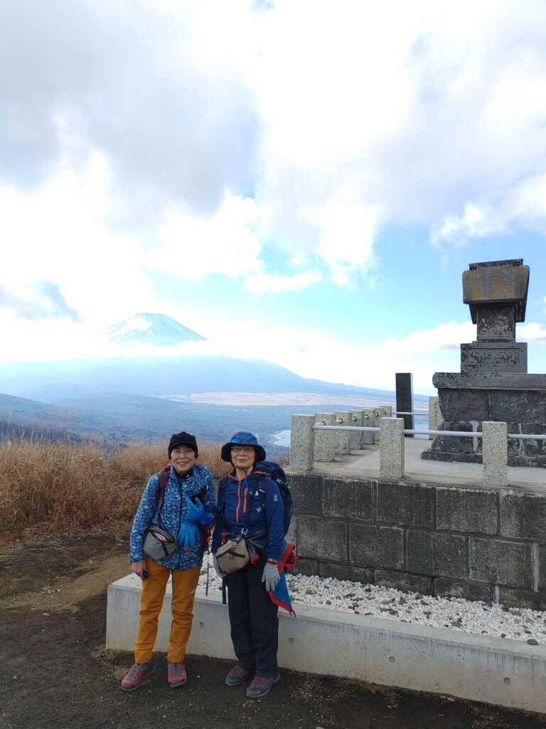三国峠からは登山道はがらっと急な直登コースに変わります。距離は短いけれど、ざらざらした砂のような地面なので滑り落ちそうなほど。ハアハアしながら頑張るとパーッと視界が開け、鉄砲木の頭に着きました。富士山と山中湖の雄大な景色が私たちを待っていてくれました。雲で時々一部が隠されてしまっても、それでも十分見応えがあります。今日一番の人気スポットで、賑やかな子どもたちと大きなワンちゃんも連れた家族連れと一緒になりました。実はこの絶景が見たくて私はこのコースに参加したのです。
