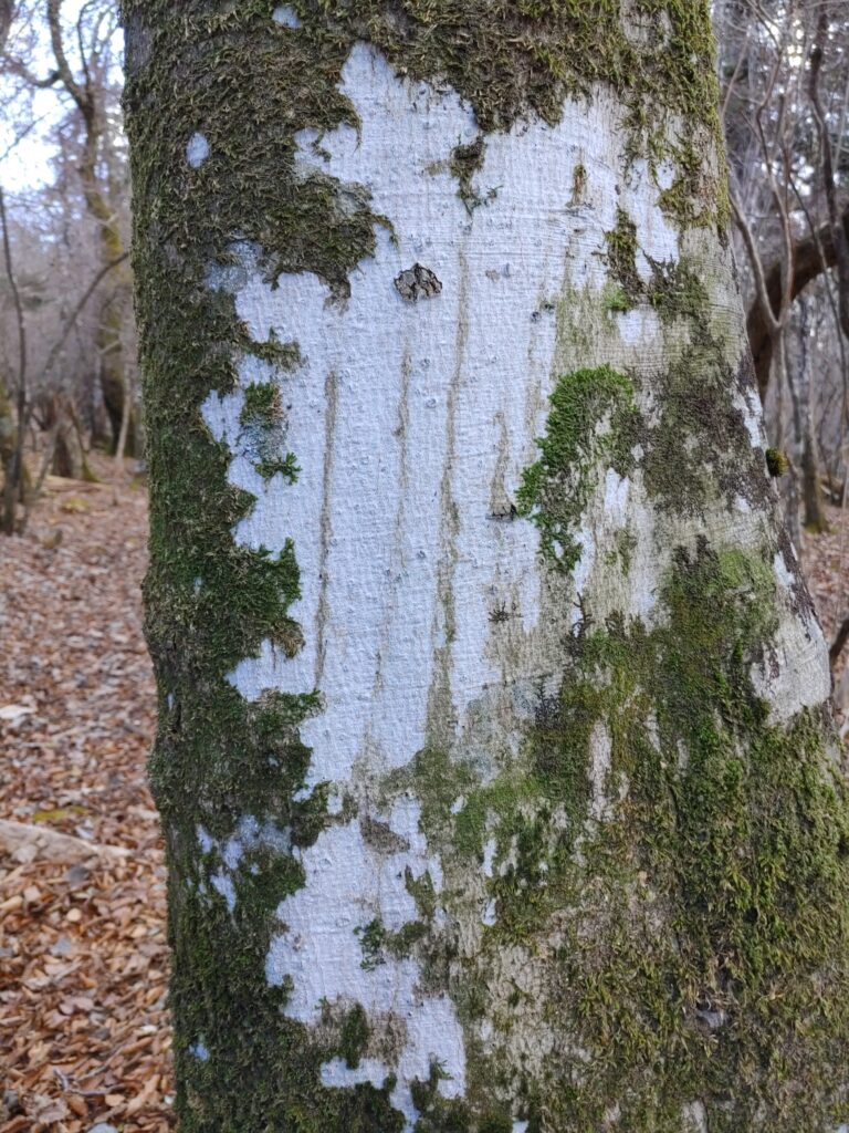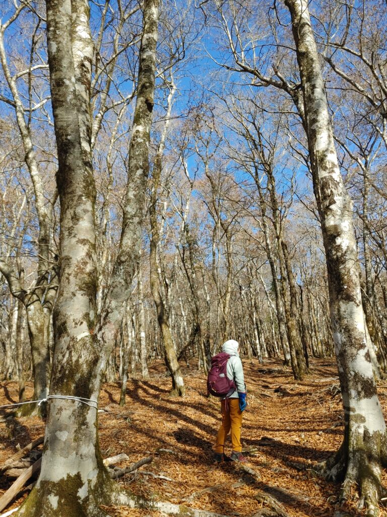 だんだん傾斜がでてきて、ブナの木が目立ち始めると大洞山に着きます。風が出てきて寒~い。指がかじかみ震えそう。急いで脱いでいた服をすべて着てお昼休憩をとりました。大洞山を下り楢木山へはけっこうな登りですが、美しいブナ林に目を引かれます。