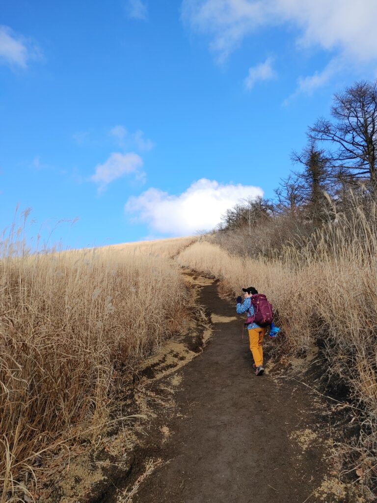もっとゆっくり景色を味わいたいところですが、バスの時間もあり平野のバス停めざして下山です。私の頭が隠れるぐらいの高いカヤトの中を進みます。周りが見えず、まるで迷路の中を歩くよう。少し遠まわりしましたが無事パノラマ台に着ました。最後の富士山と山中湖の景色を楽しんでから、30分近い車道歩きの末に平野のバス停に到着です。忘年山行に参加でき、素晴らしい富士山と山中湖の絶景を楽しめたことに感謝でいっぱいです。企画実行していただいたリーダーと山行部の皆様、どうもありがとうございました。