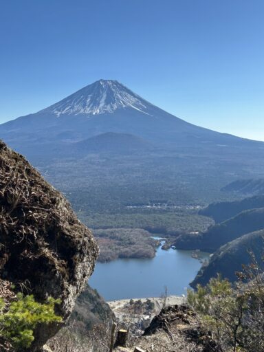 標高1,422m。山頂南側から見える、精進湖の上に富士山が大室山を抱えているような「子抱き富士」は、必見。山名は、三つの旧村(八坂・精進・古関)の境界になっていたからと言われる。