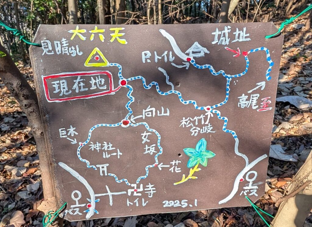 【行程】新松戸 7:24 = 西国分寺 8:27/8:34 = 高尾駅 8:59 → 高尾駅北口 9:00(徒歩)→ 宮の前バス停 9:30 → 太鼓曲輪尾根登り口 9:35 → 摺差北分岐(北高尾山稜)11:50 → 熊笹山 12:20 → 富士見台 12:40(昼食15分)→ 八王子城山 13:46 → 三叉峠 14:15 → 向山北砦 14:30 → 心源院 14:50 → 川原宿バス停 15:15
