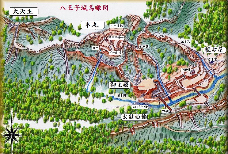 *八王子城鳥瞰図は、「余湖くんのお城のページ」より、管理人様のご了承を得て転載させていただきました。