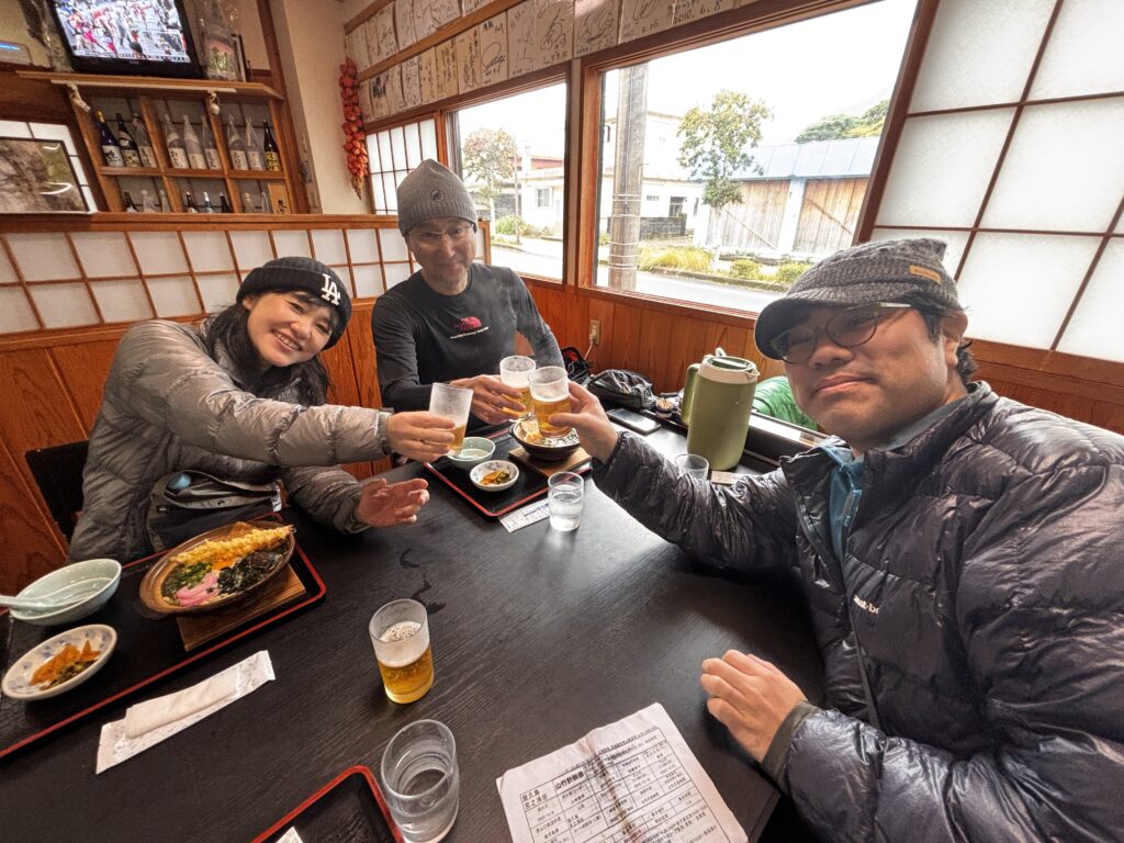 宮之浦港に戻って夕飯前のプレ乾杯。でも服は濡れていて寒いのでなべ焼きうどんで体をあっためてからビールで冷やす。なんのこっちゃ