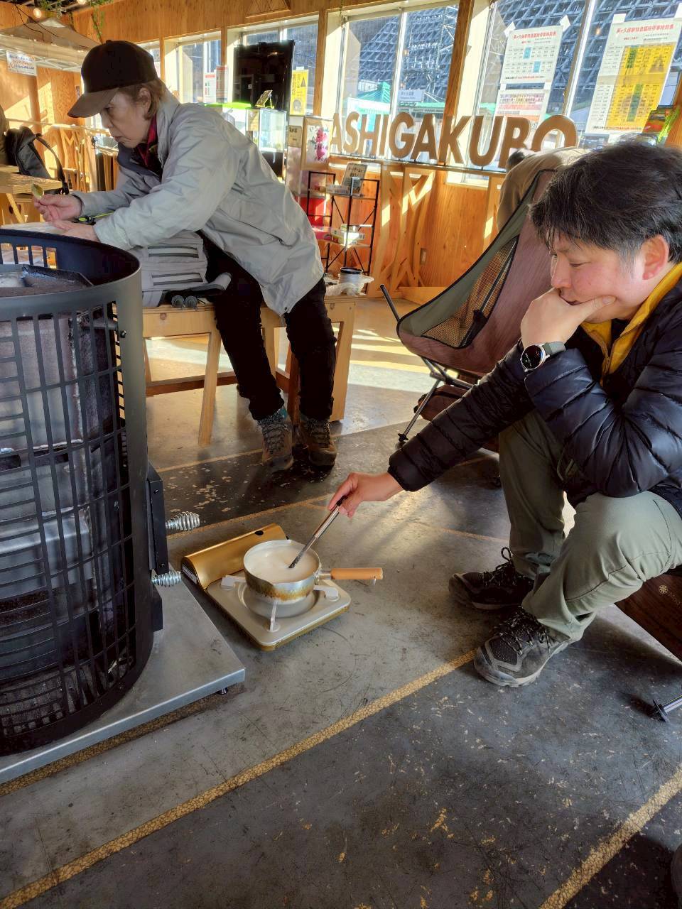 さてさて、駅前の無人休憩所(屋根あり)で甘酒の作成です(温めるだけ)