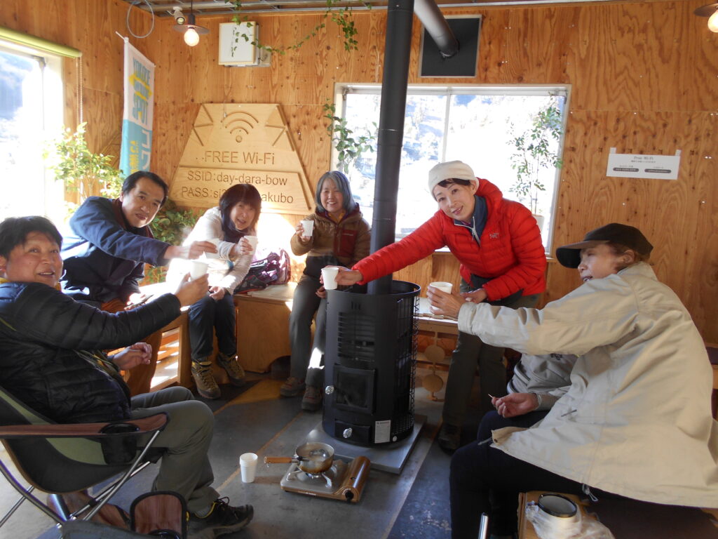 サブリーダーから急遽リーダーに昇格お疲れさんでした。又甘酒と温めるガスコンロ持参、名物のシャクシナ迄準備して頂き有難うございました。甘酒は冷えた体に優しく温めてくれ、初めて頂くシャクシナも美味しかったです。大寒波到来の中さすがに約1000mの頂上は強風もあり寒かったですが無事下山できました。帰りは農家の庭先で販売していた菊芋(初めて知りました)がお勧めという事で購入、これから皆さんからいただいたレシピを見ながら男の料理と言えるかどうかははなはだ疑問ではありますがチャレンジします。最後は松戸での反省会で盛り上がり無事帰宅できました。又の機会宜しくお願いします。