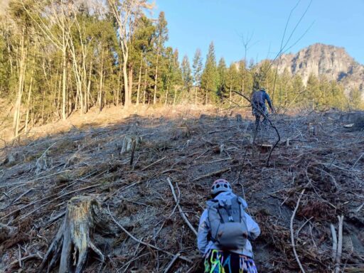 丁須の頭方面の登山道入口を通り過ぎ、しばらくして、「ここら辺かな?」という伐採された何も無い尾根を登り始めます。