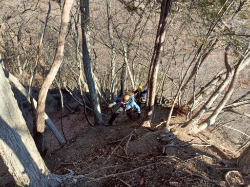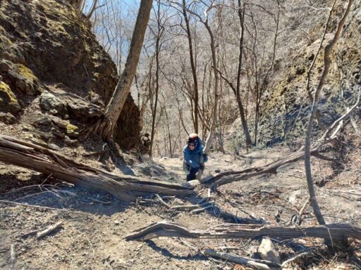 四つん這いになり、手で木や岩を掴みながら道なき道を登り詰めます。