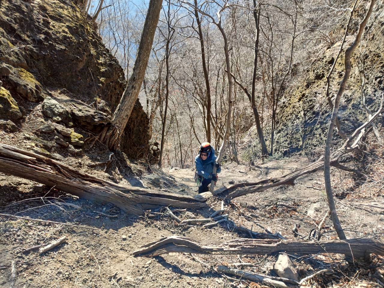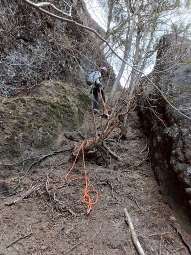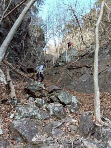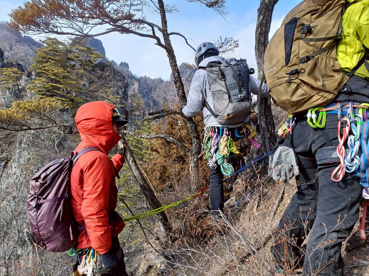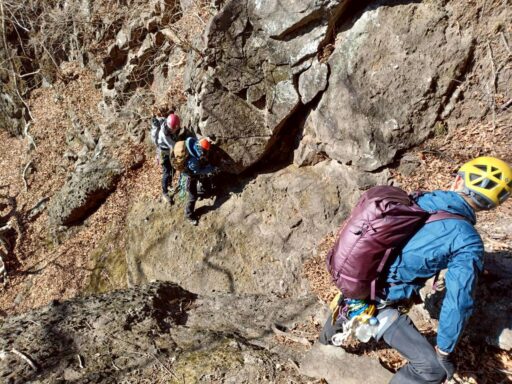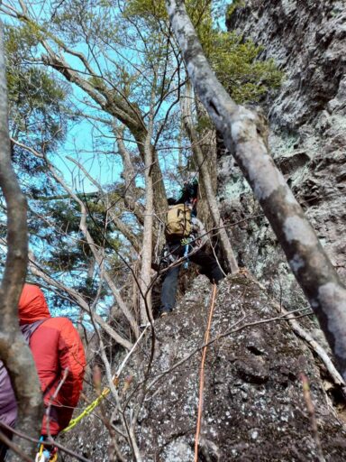ロープを出してまずはリーダーのO田が登ってみるが、、、怖い。