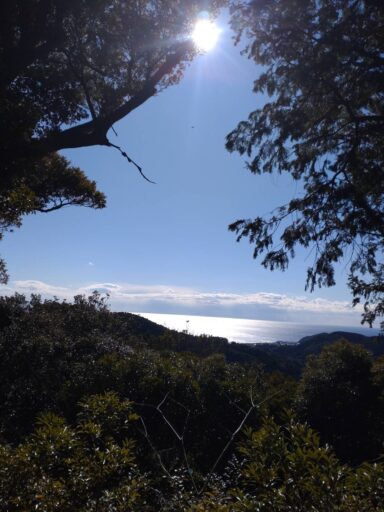 登山道は本当に花嫁が歩いたのか?と思うような急な坂もあり、昔の人の苦労が偲ばれます。木々の間から海が望めました。