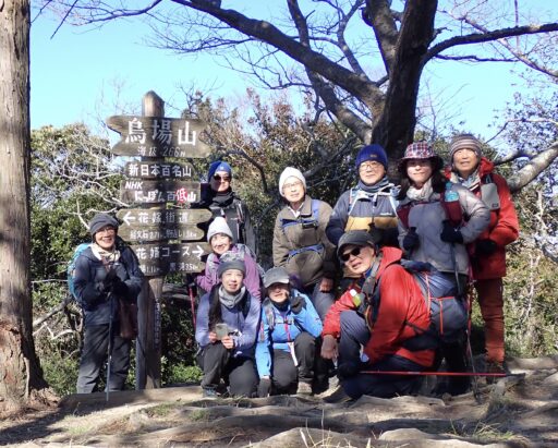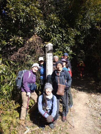 烏場山山頂で集合写真。山頂には「男女年令問わず縁結承ります おふく」の石像がありましたが皆さんその必要はなさそうです。