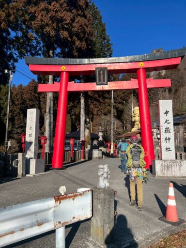 中ノ嶽神社の鳥居をくぐり、長く急な階段を登って安全祈願をして登山口へ。
