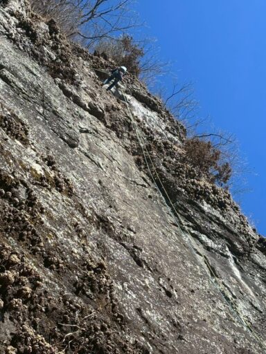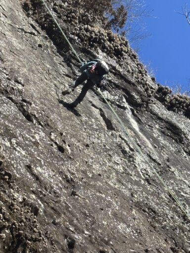 前回はここで回収しようとしたロープが引っかかり、翌日妙義山岳会のMさんが取りにきてくださったのでした。さあロープを素早く引いて‼️あんこちゃんのおかげでロープはスルスルと手元に落ちてくれました。
