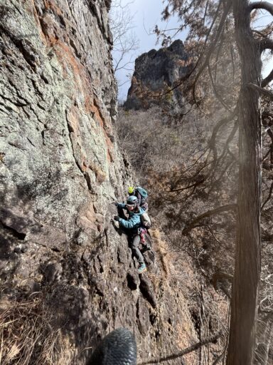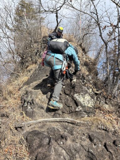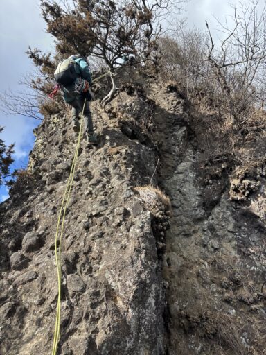 星穴山頂に行く手前に、15メートルほどの岩壁があり、そこはロープを出して後続を引き上げました。