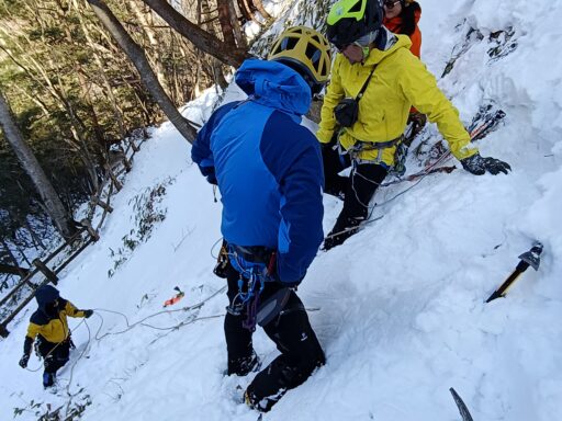 吹き溜まりでスノーボラードやピッケルで支点の取ろうとしますが、雪が浅くて中々思うように練習にはなりません。
