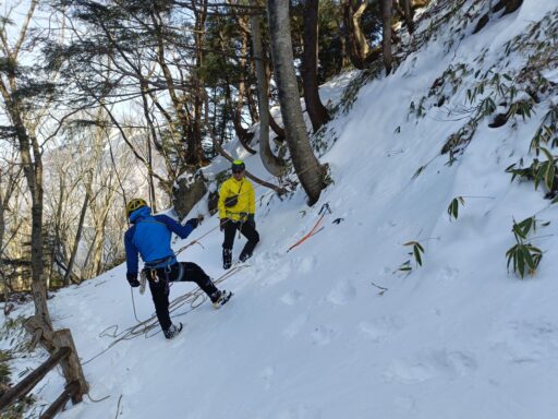 それでも鬼教官は新人に技を教えるべく、熱心にロープワーク指導。