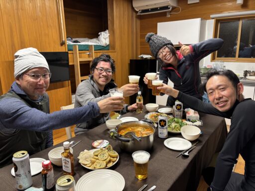 買い物班が肉や酒を買い足し、大宴会。新人たまちゃんを交えて、山や会について熱く語り合ったのでした。