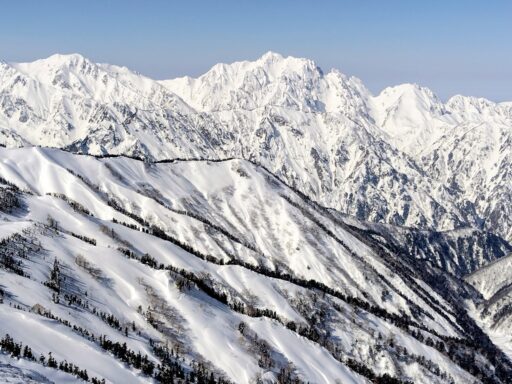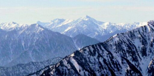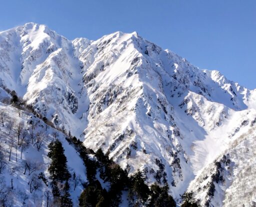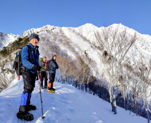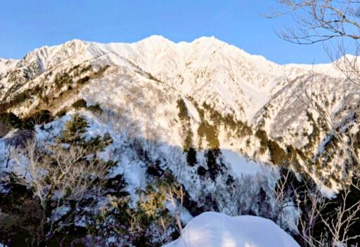 風が弱い場所まで下りて昼休憩を取ったら本格的に下山開始です。時々アイゼンの爪でつまづき転げたりして、全身で東尾根を感じながら歩きました。JPからは樹林帯に入ってしまうので、午後の日差しで神々しく輝く爺ケ岳を最後にしっかり目に焼き付けました。この後最大の核心を経て無事に下山して山行終了。澄んだ空気の中、青と白のコントラストが高い山岳美に、冬の北アルプスは理屈抜きで素晴らしく山に登る者にとって聖地であると実感しました。