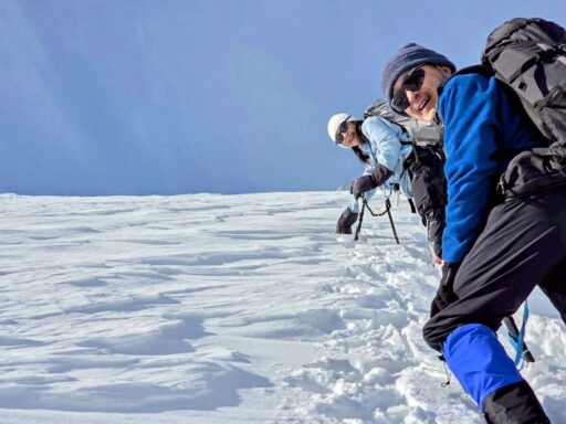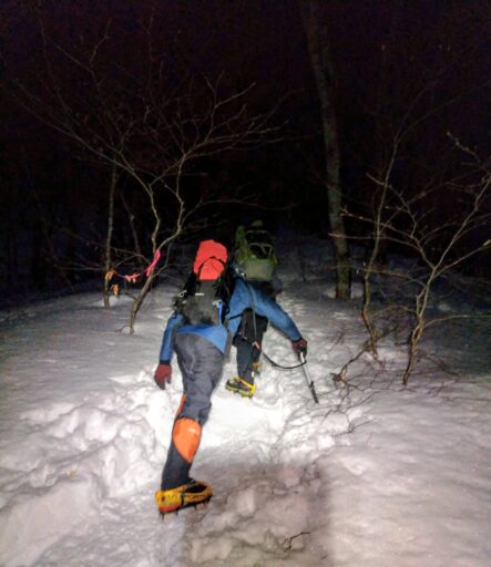 予定通りの4時半にスタートしましたが、真っ暗な中での急登、それも土と落葉と雪のミックスというデンジャラス斜面、そして前夜のリーダーの指令も虚しく 理性のブレーキが効かなかったせいで早くもみんな死にそう🤮 アイゼンとピッケルが雪面に刺さる音だけの暗闇を無言で歩き続けるうちに樹林帯を抜け、日出時刻を迎え空が明るくなってきました。