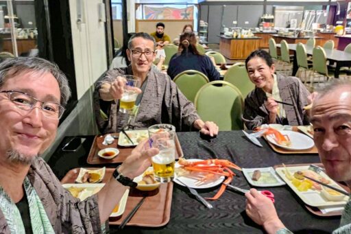 反省会の写真と見せかけて、じつは前泊のホテルで飲み放題食べ放題に浮かれてる図です。最初の計画は、初日にP3まで登りテン泊、2日目山頂アタックして下山、後泊して温泉&宴会、3日目ゆっくり帰松の予定でしたが、初日と2日目のヤマテン予報は爆風、稜線上を歩けそうなのは3日目だけ。さてどうする? とりあえずP3までは行ってみて現地判断で、しかたないもんねって撤退する?
