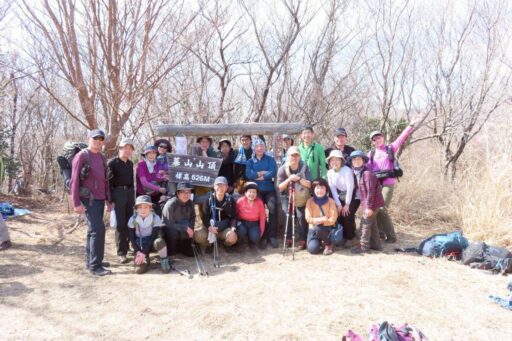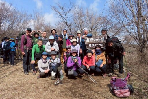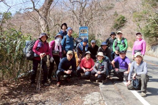 天照山バス停の標識を頂上として皆で記念撮影。