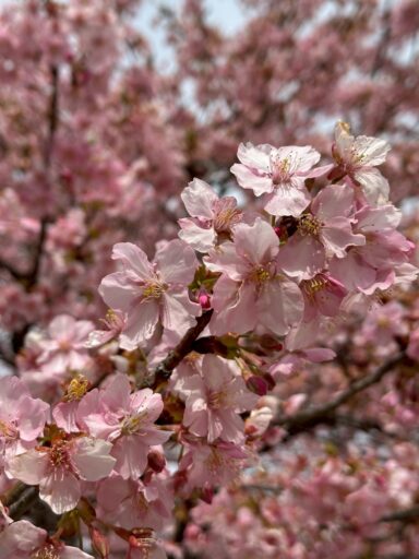 お腹を満たした後は、帰りのバスを待つ間に少しだけお花見を。早咲きの河津桜が鮮やかなピンク色の花を咲かせていました。