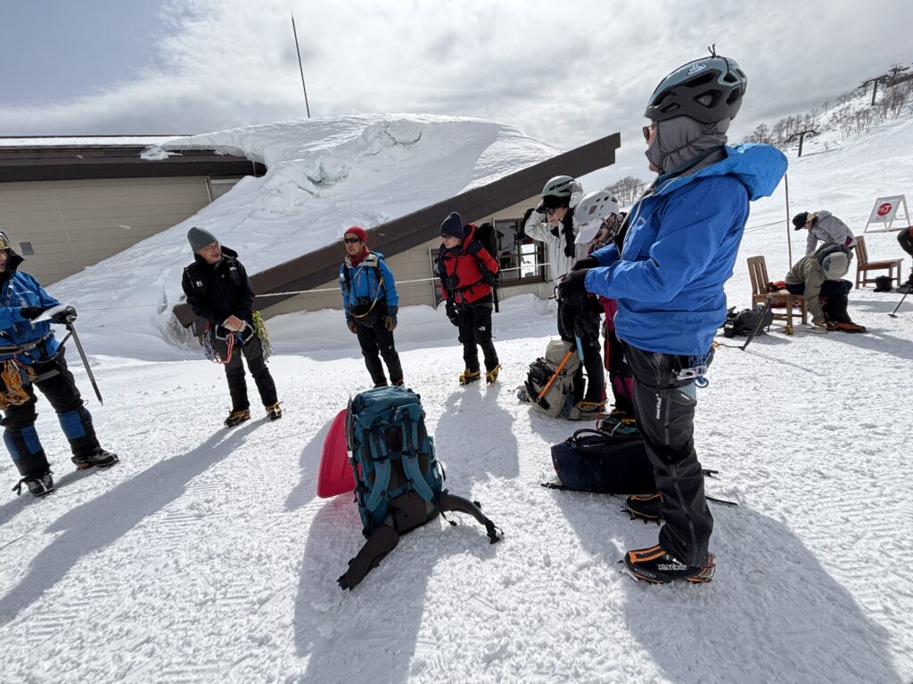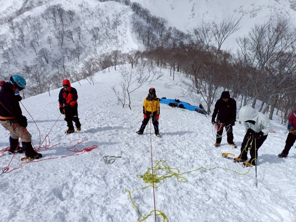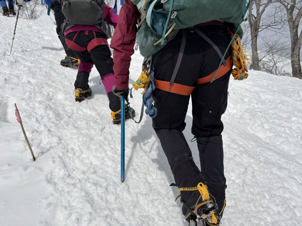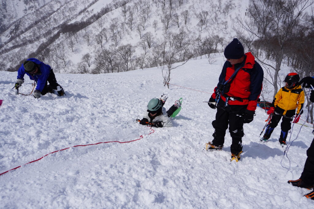 素早くうつ伏せになって、ピッケルで停止。「前のめりからの停止」は怖かった。下向きの斜面に頭から転ぶのって怖かったです。実践で止められる気がしない