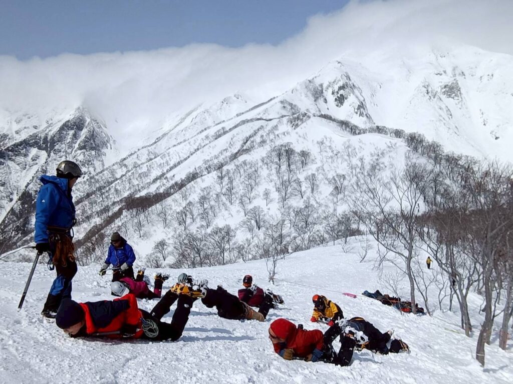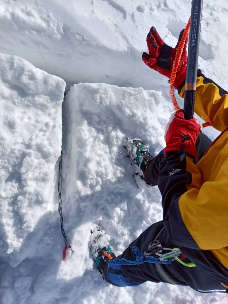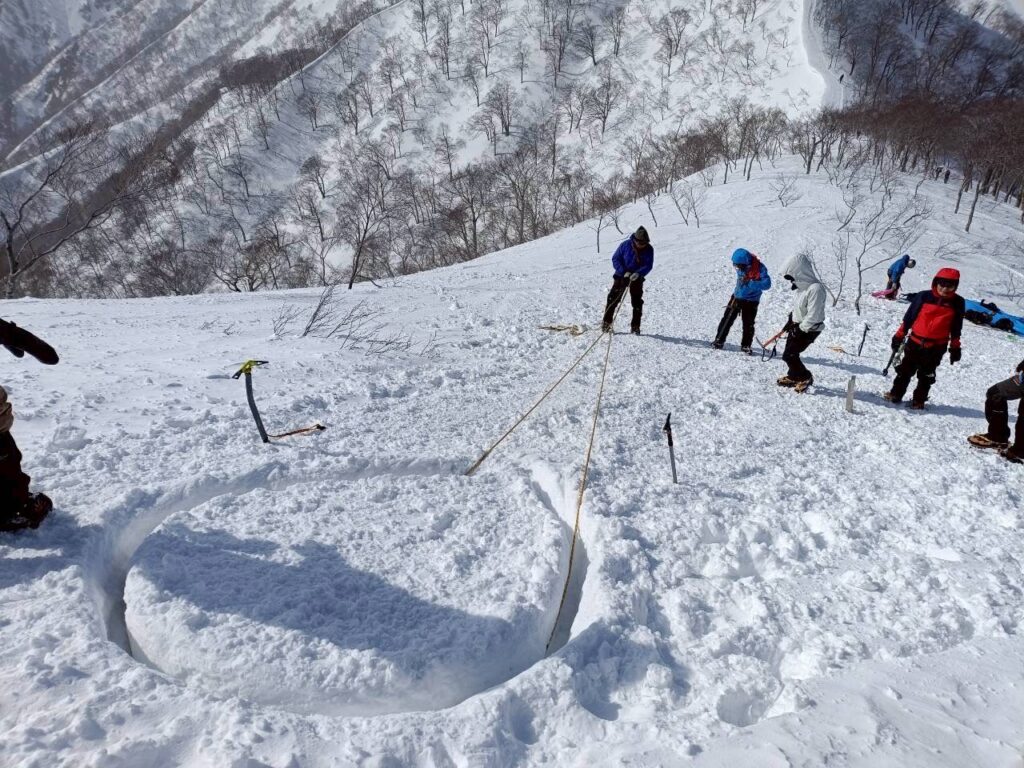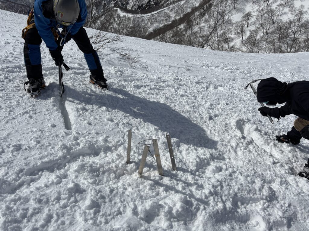 素早くうつ伏せになって、ピッケルで停止。「前のめりからの停止」は怖かった。下向きの斜面に頭から転ぶのって怖かったです。実践で止められる気がしない