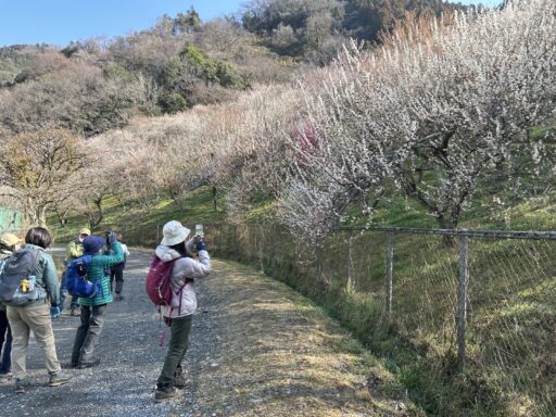 林道を戻って梅林に寄ったが、上の方の梅の花は終わっていました。私たちはもう一つの目的のコチャルメソウをみに日蔭沢に移動します。