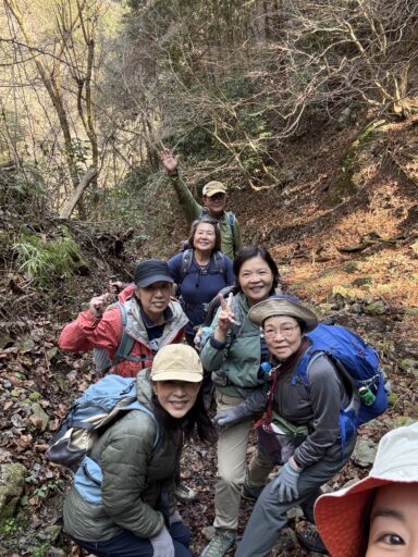 今回の参加者はリーダーМ藤さん、О沢さん以外は、花に詳しいS木ひさん お花好きの Rさん H井さん、他の目的のために参加したY田と、花にまったく興味ないW田パパさんというメンバーで歩き始めます。お天気は上々気持ちの良いハイキング日和です。まずは小下沢梅林、まだお花が残っていました。