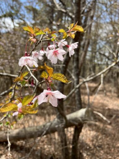 所々開けた明るい休憩スポットがありますが、基本的に狭い樹林帯を歩いていきます。所々にマメザクラがまだ残っており、ランプシェードのように花を吊り下げて咲く姿に癒されます。