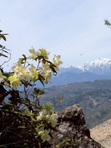 巾着状に蛇行する犀川が全景を現し、岩場にはヒカゲツツジがちらほら見え始める。